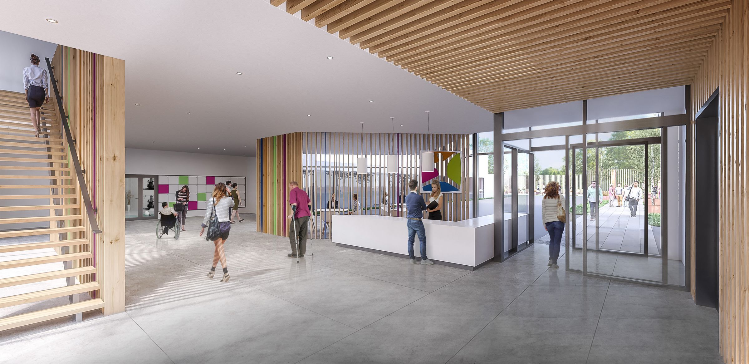 Le coeur du projet, c’est le hall d’entrée et le foyer. Centre de gravité de l’ensemble, il met en communication : direction, pôle médico-social; enseignement général et ateliers ; ESAT restauration ; ESAT espaces verts ; les logements, accessibles par une galerie extérieure couverte. La boutique, le restaurant qui prolongent le hall sont conçus pour permettre la rencontre entre résidents et habitants du quartier. L’ensemble du bâtiment est conçu pour faciliter le quotidien des personnes handicapées.