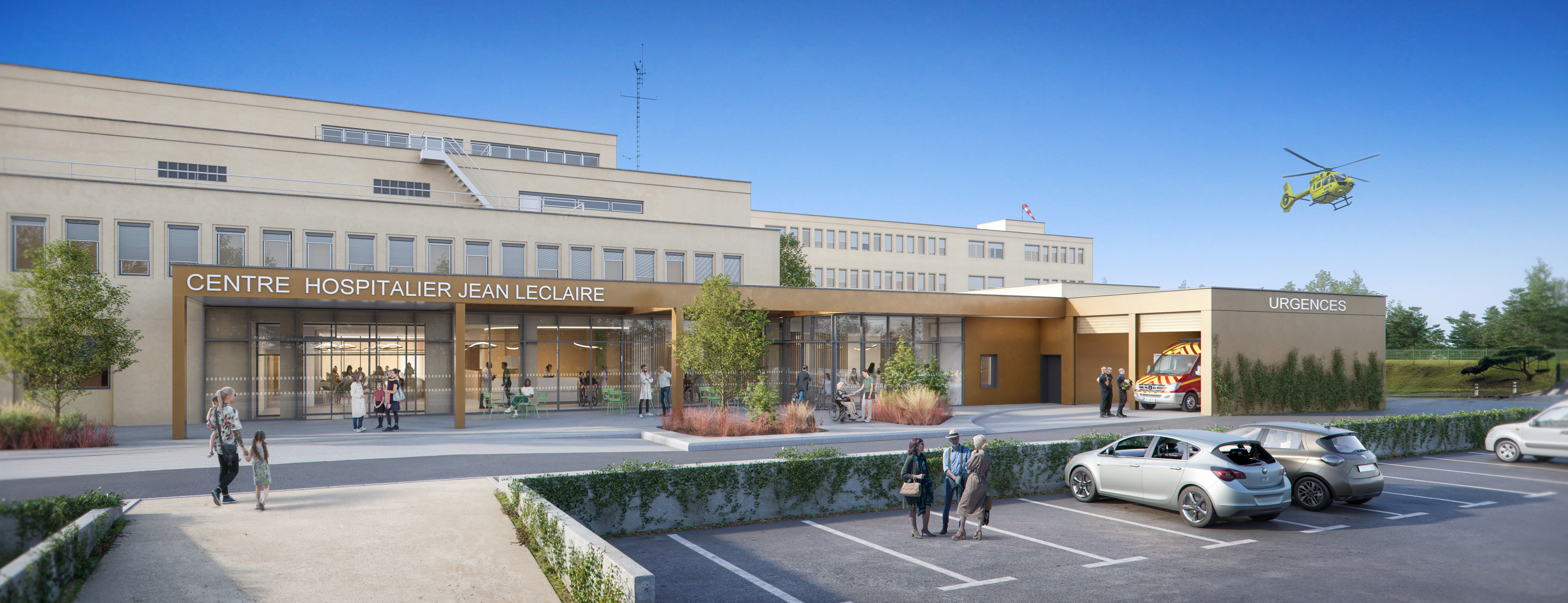 Pour renforcer son attractivité et répondre aux besoins locaux et saisonniers, l’hôpital de Sarlat se restructure avec un nouveau service d’urgences, des admissions et des consultations modernisées. Dès le parking, la nouvelle façade et l’entrée des urgences sont visibles, guidées par un parvis accueillant avec signalétique, auvent et aménagements paysagers. Le hall d’attente, lumineux et ouvert sur le patio, prolonge naturellement l’espace extérieur. Les couleurs et matériaux naturels créent une ambiance apaisante, atténuant le caractère dramatique de l’arrivée aux urgences.