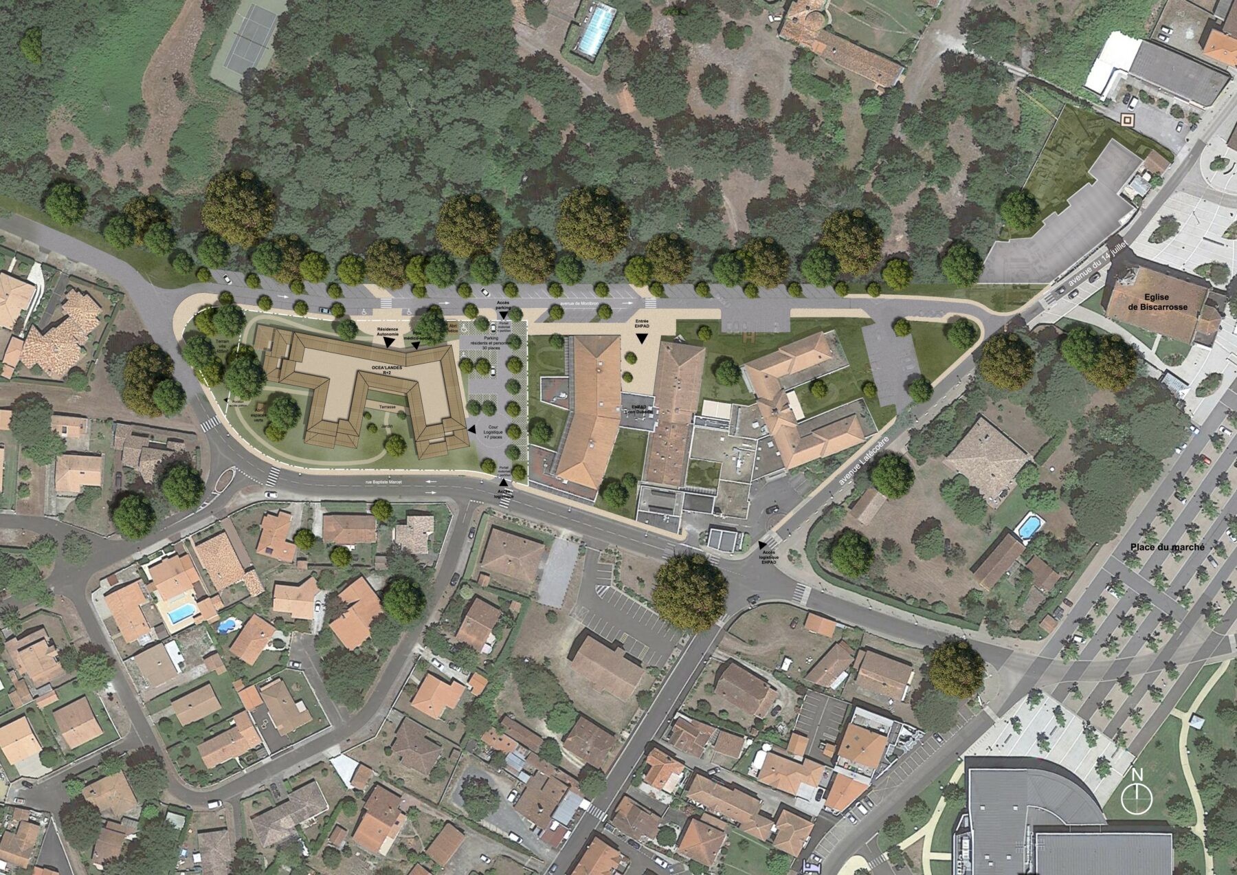 Afin de profiter d’un emplacement privilégié, la Résidence Autonomie de 57 logements s’ancre sur un site boisé dans le centre de Biscarrosse.